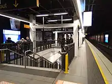 The Wynyard Walk is a 180-metre-long (590 ft) pedestrian link and tunnel between Wynyard station and Barangaroo that opened in September 2016,[11] with a Clarence Street entrance that opened in December 2016. Based on a design by architecture firm Woods Bagot,[12] the project combined a new entrance, a pedestrian tunnel, a pedestrian bridge, and a new pedestrian plaza. Wynyard Walk provides direct access via tunnels to Clarence, Kent and Sussex streets.[13][14] Wynyard Walk features a huge video screen showcasing digital art.[15]