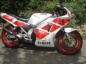 Yamaha produced the road going two-stroke motorcycle, loosely based on the TZ250 Yamaha racing bike. Parallel-twin, reverse cylinder and finally 90° V-twin variants were produced. It evolved as a natural replacement for the popular RD 250/Yamaha RD350LC series of the 1980s. It has the Yamaha Power Valve System 'YPVS' which raises and lowers the exhaust port depending on the rpm of the engine. The YPVS servo motor starts to open at about 6,000rpm. In standard form it produced 45 hp due to the restrictive standard exhausts and ignition boxes.[2]