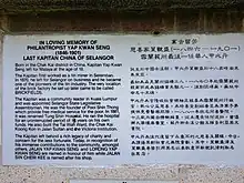Kapitan China Yap Kwan Seng (Chinese: 葉觀盛; Pha̍k-fa-sṳ: Ya̍p Kôn-sṳ̀n; 1846 – 1902) was the fifth and last Kapitan China of Kuala Lumpur from 1889 to 1902. Kapitans were appointed chiefs or headmen of the various ethnic communities during the period of British colonial rule in what is present-day Malaysia. Kapitans played an important role in the history of the Chinese in Malaysia. They wielded considerable influence, contributing to social, economic and political development in areas under their jurisdiction.