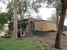 The library complex was officially opened on 22 May 1994. It was designed by Melbourne architect Greg Burgess and won the Royal Australian Institute of Architects' Institutional Architecture Award in 1995.[45] The setback, height of walls and the roof, materials and colours were chosen to complement its natural setting. 14,100 mudbricks were made locally for the building.[46] An extensive re-modelling and renovation took place in 2010, adding more space with the removal of the large circulation desk turning this into a reading corner, adding more computers.[47] A new children's courtyard was also established at that time, designed by Jeavons Landscape Architects in collaboration with Greg Burgess Architects.[48]