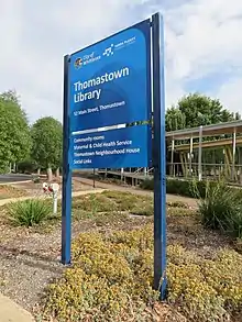 The library opened in April 1993.[88] In 2005 Thomastown Library was extended to include meeting rooms, a computer room with 16 terminals, a landscaped courtyard, storage area and kitchenette and revamped children's area which was lauded as a community hub and a model for community projects across Victoria by the State Government.[89] Three art projects were also implemented at this time which included an outdoor mosaic work incorporating the themes of water, migration and Edgar's Creek, a 10-metre long curved glass entry wall and circulation desk windows featuring images of local people and places and the teenage area features images of local teenagers involved in a number of activities.[90] In early 2016 building extension works took place for a multiple purpose room and office space and office reconfiguration works to provide two maternal & child health centre[91] consulting rooms, waiting area and program room within the community hub.[92]