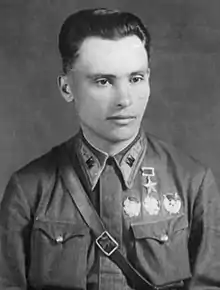 Yevgeny Petrovich Fyodorov (Russian: Евгений Петрович Фёдоров; 28 December [O.S. 15 December] 1911 – 15 July 1993) was a Soviet Air Force major general and double Hero of the Soviet Union. From 1933 Fyodorov served as a pilot in a Long Range Aviation regiment. He was a squadron commander during the Winter War and was awarded the title Hero of the Soviet Union for conducting bombing sorties. Fyodorov served with Long Range Aviation during World War II and was awarded the title Hero of the Soviet Union a second time for making strategic bombing sorties in June 1945. Fyodorov retired as a major general in 1958 and lived in Leningrad, where he worked at the airport.[1]