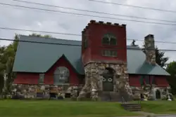 Young Memorial Church, also known as Brier Hill Congregational Church, is a historic Congregational church in the hamlet of Brier Hill in Morristown, St. Lawrence County, New York. It was built in 1907–1908 and is a one-story, stone and wood shingled church building in the Arts and Crafts style. It features a steeply pitched gable roof, a tall stone chimney, opaque art glass windows by Harry James Horwood, and a central two-story square tower with a crenelated top.[2]