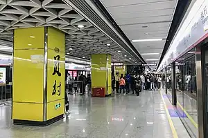 Yuancun Station (simplified Chinese: 员村站; traditional Chinese: 員村站; Cantonese Yale: Yùhnchyūn Jaahm) is an interchange station between Line 5 and Line 21 of Guangzhou Metro, and also the terminus of Line 21.[1] It is located under the junction of Huacheng Avenue East (Chinese: 花城大道东) and Yuancun 2nd Cross Road (Chinese: 员村二横路) in Tianhe District. It lies to the east of Zhujiang New Town and to the north of Pazhou,[2][3][4] and was opened on 28 December 2009.[5]