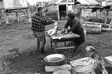 Yup’ik cuisine is different from Alaskan Iñupiaq, Canadian Inuit, and Greenlandic diets. Yup'ik communities varied widely in what foods were available to them, but everyone used similar food processing and food preservation methods, including air drying and smoking, food storage in cold water and oil, fermentation, and freezing. Some foods were eaten raw.[4]