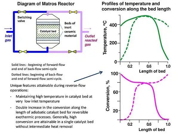 - “The use of heat regeneration in chemical reactors has enjoyed a renaissance since the 1980s largely due to the pioneering work of Matros and Boreskov. The insight of Matros and associates was to couple the principle of heat regeneration and the catalytic fixed bed in the reverse flow reactor and to recognize that the efficacy of this technique was tailor-made for dilute gaseous reaction systems exhibiting adiabatic temperature rises in the range 10-100°C.”[15]