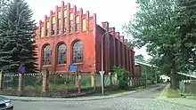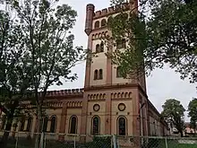 Due to the Nazi regime's legislation restricting the rights of German Jews, including the prohibition of Jewish people from owning businesses, the factory was confiscated from the Fränkel-Pinkus family in 1938 and the family was forced to flee Germany.[1] The company was then renamed Schlesische Feinweberei AG. In late September, 1944, the Nazi regime established a sub-camp of Auschwitz in the factory where about 400 women, mostly Jews from Hungary, were forced to work on the spinning machines. The factory was known as and was directed by SS-Oberscharführer Bernhard Becker with twenty additional members of the SS. The subcamp was shut down on 19 January 1945 and the women there were forced to march by foot to the Gross-Rosen concentration camp.[2] From there they were then taken to the Bergen-Belsen concentration camp; it is unknown who among them survived.[3][4]