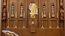 The esteemed Danish sculptor Bertel Thorvaldsen’s “Christus” takes the position of honor in the reredos. Thorvaldsen’s Christ shows a young man whose idealized body is draped in a heavy cloth that leaves part of his torso and right arm bare. His arms are outstretched in a gesture of welcome, embodying the Christian biblical quote, "Come to me all you who labor and are heavily burdened, and I will give you rest" (Matthew (11:28).