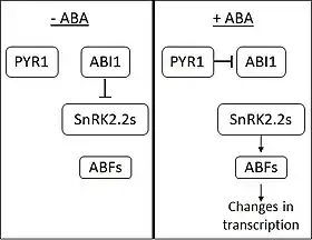Na ausência de ABA, a fosfatase ABI1-INSENSITIVE1 (ABI1) inibe a ação das proteínas cinases relacionadas a SNF1 (subfamília 2) (SnRK2s). O ABA é percebido pelas proteínas de membrana PYRABACTIN RESISTANCE 1 (PYR1) e do tipo PYR1. Na ligação ABA, PYR1 se liga a e inibe ABI1. Quando os SnRK2s são liberados da inibição, eles ativam vários fatores de transcrição da família ABA RESPONSIVE ELEMENT-BINDING FACTOR (ABF). Os ABFs então causam mudanças na expressão de um grande número de genes.[2] Acredita-se que cerca de 10% dos genes das plantas sejam regulados pelo ABA.[carece de fontes]