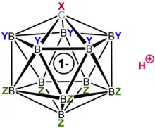 Ácidos carborano H(CXB11Y5Z6) (X, Y, Z = H, Alk, F, Cl, Br, CF3) são uma classe de superácidos.[1] Estima-se que são um milhão de vezes mais fortes do que o ácido sulfúrico alguns 100% em termos das sua função de acidez de Hammet com valores (H 0 ≤ -18) e possuem os valores de pK a abaixo dos -20, estabelecendo-los como alguns dos mais fortes ácidos de Bronsted conhecidos.[2][3][4] O exemplo mais bem estudado é o derivado altamente clorado H (CHB11Cl11 ). Verificou-se que a acidez do H(CHB11Cl11 ) excedia largamente a do ácido tríflico, CF3SO3H, e bistriflimide, (CF3SO2)2NH, compostos anteriormente considerados como os ácidos isolados mais fortes.