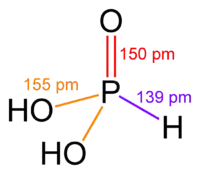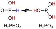 H3PO3 é melhor descrito fórmula estrutural HPO(OH)2. Essa espécie existe em equilíbrio com um tautômero P(OH)3 (em pequena quantidade). O P(OH)3 é observado como ligante ligado ao molibdênio.[1][2] Outros oxiácidos do fósforo importantes são o ácido fosfórico (H3PO4) e o ácido hipofosforoso (H3PO2)