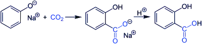 O salicilato de sódio é comercialmente preparado por tratar fenóxido de sódio com uma alta pressão de dióxido de carbono a alta temperatura via a reação de Kolbe-Schmitt. A acidificação da solução do produto dá o ácido salicílico: