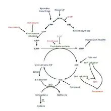 Ácido tetraidrofólico é produzido do ácido diidrofólico pela diidrofolato redutase. Esta reação é inibida por metotrexato.[1]