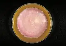 Vista do verso de uma placa de ágar Sabouraud com colônia de Trichophyton rubrum var. rodhaini.