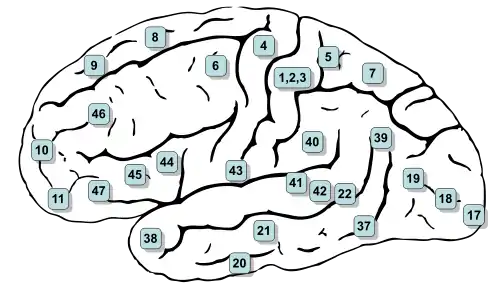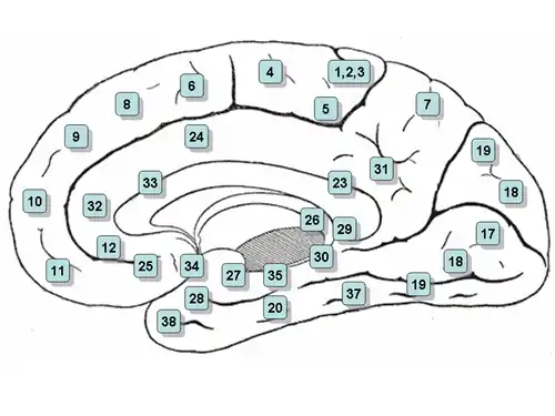 (**) Algumas das áreas originais Brodmann foram subdivididas, por exemplo, "23" e "23b";[8]