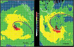 A força de Coriolis causada pela rotação da Terra é o que dá aos ventos em torno de áreas de baixa pressão (como em furacões, ciclones e tufões ) a sua circulação no sentido anti-horário no hemisfério norte (conforme o vento se move para dentro e é desviado para a direita do centro de alta pressão) e circulação no sentido horário no hemisfério sul (conforme o vento se move para dentro e é desviado para a esquerda do centro de alta pressão).[51] Um ciclone tropical difere de um furacão ou tufão com base apenas na localização geográfica.[52] Observe que um ciclone tropical é fundamentalmente diferente de um ciclone de latitude média.[53] Um furacão é uma tempestade que ocorre no Oceano Atlântico e no nordeste do Oceano Pacífico, um tufão ocorre no noroeste do Oceano Pacífico e um ciclone tropical ocorre no Pacífico sul ou Oceano Índico.[54] O atrito com a terra diminui a velocidade do vento que flui para os sistemas de baixa pressão e faz com que o vento flua mais para dentro, ou flua mais envelhecidamente, em direção a seus centros.[50] Os tornados são frequentemente muito pequenos e de duração muito curta para serem influenciados pela força de Coriolis, mas podem ser influenciados quando surgem de um sistema de baixa pressão.[55][56]