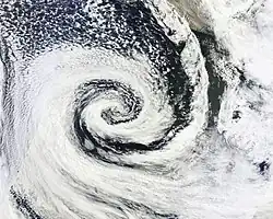 Ciclones extratropicais se formam como ondas ao longo das frentes meteorológicas devido à passagem de ondas curtas no alto ou jato de nível superior antes de ocluir posteriormente em seu ciclo de vida como ciclones de núcleo frio.[17][18][19][20] Baixas polares são sistemas de baixa pressão atmosférica de curta duração e pequena escala que ocorrem nas áreas oceânicas em direção aos pólos da frente polar principal nos hemisférios norte e sul. Eles são parte de uma classe maior de sistemas climáticos de mesoescala. Baixas polares podem ser difíceis de detectar usando relatórios meteorológicos convencionais e são um perigo para operações em alta latitude, como transporte e plataformas de gás e petróleo. Eles são sistemas vigorosos que têm ventos próximos à superfície de pelo menos 17 m/s (38 mph).[21]