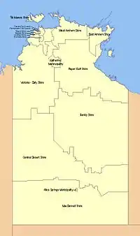 Exstem 17 LGAs no Território do Norte, mais a área não incorporada na região de Darwin e na Austrália Central. LGAs podem ser cidades designadas, municipalidades, regiões ou não ter designação, mas em legislação todas as LGAs são classificadas como Metrópole (C), Cidades (T) e Vilas (S). Existem apenas conselhos que são considerados municípios.