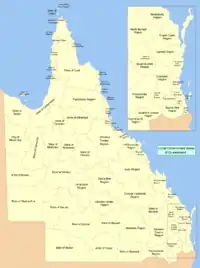 Existem 73 LGA's em Queensland, incluindo os conselhos aborígenes que tenham pleno Conselho do Condado a partir de Janeiro de 2007. Tipos de estatuto LGA ou classificadores atualmente em uso são: Cities (C), Shires (S), Towns (T) e Island Councils (IC).