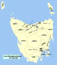 Existem 29 LGA's na Tasmânia. Tipos de estatuto LGA ou classificadores atualmente em uso são: Cities (C) e Municipalities (M).