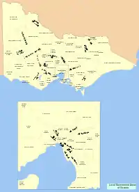 Existem 79 áreas de governo local em Vitória, com tipos de estatuto LGA ou classificadores atualmente em uso são: Cities (C), Rural Cities (RC), Boroughs (B) e Shires (S). Existe apenas um município (o único na Austrália), o Borough, de Queenscliffe.