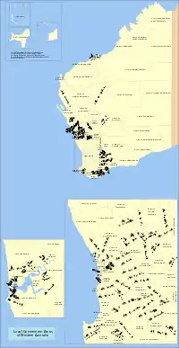 Existem 144 LGA's na Austrália Ocidental, que incluem a Ilha Christmas e as Ilhas Cocos. Tipos de estatuto LGA ou classificadores atualmente em uso são: Cities (C), Towns (T) e Shires (S).