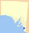 | Conselho Wattle Range | Millicent | Sudeste | 1997 | 3924 | 1,515 | 12 554 | Amalgamação de conselhos distritais de Beachport, Millicent e Penola. | ![]() |