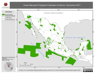 O principal sistema de protecção das áreas naturais protegidas de México é o federal, que em 2013 conta com 176 áreas protegidas administradas pela agência federal da Comissão Nacional de Áreas Naturais Protegidas (CONANP), cobrindo 25.394.779 ha e que representam 12,93 % da superfície terrestre do país.