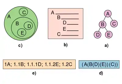 Na representação por aninhamento, também conhecida por "representação por parênteses aninhados", a sucessão de parênteses reproduz as relações entre os nodos, aninhando um nodo filho ao seu pai.[2] Como exemplo temos o item (d) da imagem ao lado representando a árvore (a).