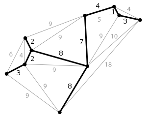 A árvore de extensão mínima de um grafo plano. Cada aresta é identificada como seu peso, o qual é aproximadamente igual ao seu comprimento.