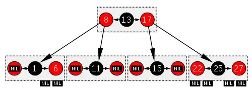 Entretanto, esta árvore B é mais geral que uma árvore rubro-negra, já que a árvore B pode ser convertida de mais de uma maneira em uma árvore rubro-negra. Se a lista de valores de um nó da árvore B contém somente 1 valor, então esse valor corresponde a um nó negro com dois filhos. Se a lista contém 3 valores, então o valor central corresponde a um nó negro e os outros dois valores correspondem a filhos vermelhos. Se a lista contém 2 valores, então podemos fazer qualquer um dos valores negro e o outro valor corresponde a seu filho vermelho.