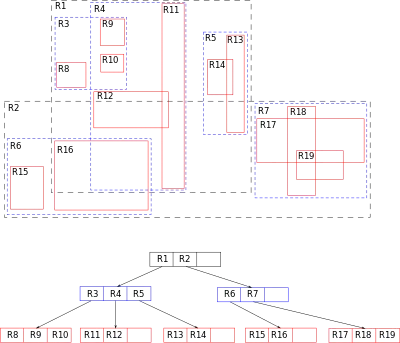 A estrutura de dados divide o espaço com aninhamento hierarquico, e possivelmente sobreposição de retangulos de limite mínimos (também chamados de caixas limitantes - bounding boxes).