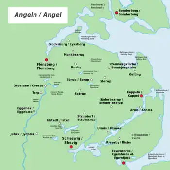 Ânglia (em alemão: Angeln, em dinamarquês: Angel, em latim: Anglia) é uma pequena península situada no interior da península maior da Jutlândia, na parte sul do Eslésvico, e que atualmente constitui a parte norte do estado alemão de Eslésvico-Holsácia, na Baía de Quiel do Mar Báltico. Para o sul, a Anglia é separada da vizinha península de Schwansen (em dinamarquês: Svans ou Svansø) pelo Schlei, e para o norte a península dinamarquesa de Sundeved e a ilha dinamarquesa de Als pelo fiorde de Flensburgo. A paisagem é montanhosa, dotada de numerosos lagos. A antiga Angeln pode ter sido um pouco maior; no entanto, as fontes antigas concordam que a península estava inclusa no território. [1]