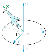 A aplicação mais popular é a de descrever as atitudes de aeronaves, normalmente usando uma convenção Tait-Bryan na qual zero graus representa a posição horizontal. Ângulos Tait-Bryan representam a orientação do respeito aeronave um sistema de eixos de referência (quadro mundial) com três ângulos que, no contexto de uma aeronave são normalmente chamados de Heading, Elevation e Bank. Ao se tratar de veículos, diferentes convenções para os eixos são possíveis.
