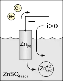 Na plha de Daniell,temos um Ânodo de zinco(formado por uma placa) imerso em uma solução formada por água e sulfato de zinco (ZnSO4). A placa de zinco, ao sofrer oxidação, libera elétrons, formando o cátion Zn+2, que permanece na solução. Com isso, a placa tem seu tamanho diminuído e a solução fica com excesso de cátions.[8]