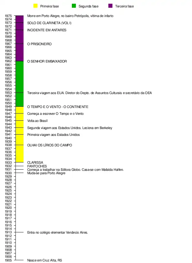 É possível distinguir três fases da obra do autor. A primeira engloba todos os romances anteriores a O Tempo e o Vento — Clarissa, Caminhos Cruzados, Música ao Longe, Um Lugar ao Sol, Saga e O Resto É Silêncio. Essa fase é caracterizada pelo registro da vida urbana da capital do estado em que o escritor nasceu, sendo por essa razão chamada de "ciclo de Porto Alegre".[14] Nessas obras, é muito usada a estratégia do corte transversal na sociedade; isto é, uma fatia da vida é isolada e apresentada na obra literária.[15] Todos os romances dessa fase estão ambientados nessa cidade (que na época contava 300 mil habitantes), explícita ou de modo subentendido, pois era onde o autor residia nessa fase de sua vida.[9]