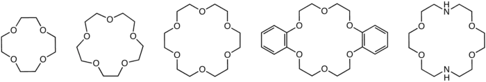 Estrutura de éteres coroa comuns: 12-Coroa-4, 15-Coroa-5, 18-Coroa-6, Dibenzo-18-coroa-6, and Diaza-18-coroa-6