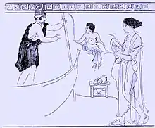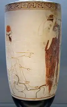 - [g] ^ Exemplos de lécitos representando Caronte foram descritos por Arthur Fairbanks[109] Exemplos com moedas também foram descritos por Fairbanks[110] e Edward T. Cook[111] Alguns exemplares estão abrigados em alguns museus famosos: Caronte e Hermes guiando uma alma do Pintor de Sabouroff no Museu Metropolitano de Arte; Caronte do Pintor de Caniço no Museu de Arte da Escola de Desenho da Ilha de Rodes; Caronte do Pintor de Timbos no Museu Ashmolean; Caronte e Hermes Psicopompo no Museu Arqueológico Nacional de Atenas.