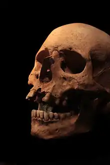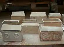 - [e] ^ Nem adultos masculinos (que esperava-se estarem preparados para enfrentar a morte iminente no curso do serviço militar) nem mulheres idosas são representados, com o comportamento mais suave de Caronte podendo ser entendido como facilitador da transição para aqueles que enfrentaram uma morte inesperada ou intempestiva.[35]