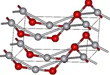 Sob pressão atmosférica o óxido mercúrico tem duas formas cristalinas: uma é chamada montroidita (ortorômbica, 2/m 2/m 2/m, Pnma), e a segunda é análoda ao sulfeto metálico cinábrio (hexagonal, hP6, P3221); ambos são caracterizados pelas cadeias Hg-O.[4] A pressões acima de 10 GPa ambas estruturas convertem-se em uma forma tetragonal.[5]