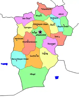 Övörkhangay está subdividido em 19 distritos (sums):