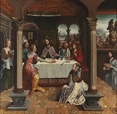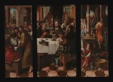 As cenas que surgem neste painel da esquerda, à excepção de Judas e do pequeno cão, sendo este um símbolo de fidelidade por oposição à traição daquele, não têm lugar na representação habitual do tema. O episódio do Lava-pés é evocado através da presença da bacia com água em primeiro plano, e as duas figuras femininas que se aproximam de Cristo, uma das quais segura a boceta com o perfume de nardo, atributo de Santa Madalena (que tem o halo de santidade, talvez em substituição do de Judas, assim se completando doze discípulos), poderão também associar-se ao Cupido, numa provável alusão à dicotomia entre Amor sacro e amor profano.[4]