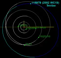 (119979) 2002 WC19 tem um semieixo maior perto da borda externa do Cinturão de Kuiper. Ele está em uma ressonância orbital 1:2 com Netuno, e, portanto, é chamado de twotino.[7] Para cada uma órbita que (119979) 2002 WC19 faz, Netuno orbita duas vezes.