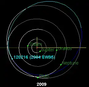 (120216) 2004 EW95 vem dentro de 9 UA de Urano e fica mais de 21 UA de Netuno durante um período de 14 mil anos.[8]