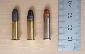 ![]() Cartuchos .22 Long Rifle – subsonic hollow point (esquerda), standard velocity (centro), hyper-velocity "Stinger" hollow point (direita). | ||