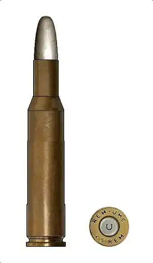 O .25 Remington é um cartucho sem aro, do tipo "garrafa", acionado por pólvora sem fumaça. Esse cartucho foi considerado muito preciso por especialistas em armas de fogo da época e adequado para animais de caça até o porte de cervos e ursos negros.[3]