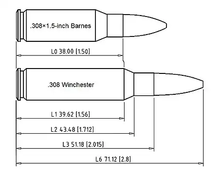 ![]() O cartucho .308×1.5-inch Barnes | ||
