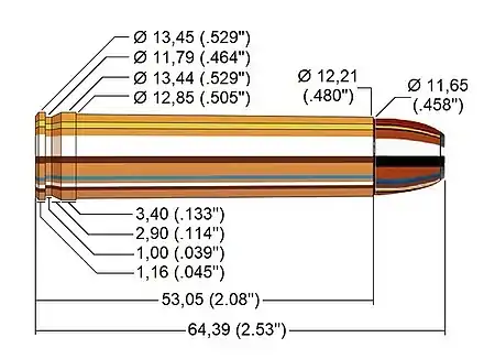 Visualmente, o estojo se assemelha ao do .458 Winchester Magnum com uma cinta mais larga.[7] O cartucho é mais útil para caça maior a curtas distâncias, sendo preciso em distâncias de 150 a 175 jardas (137 a 160 m).[4] O cartucho é capaz de abater qualquer animal grande da América do Norte, incluindo grandes cervos grandes, ursos pardos e alces.
