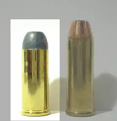 Um cartucho .45 Schofield (destacado) ao lado do familiar .45 Colt.