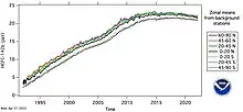 Em sua maioria, as concentrações de HCFCs na atmosfera correspondem às taxas de emissão relatadas pelas indústrias. A exceção a isso é o HCFC-142b, que tinha uma concentração mais alta do que as taxas de emissão sugerem.[9]